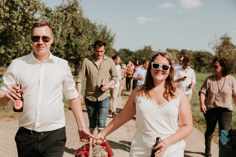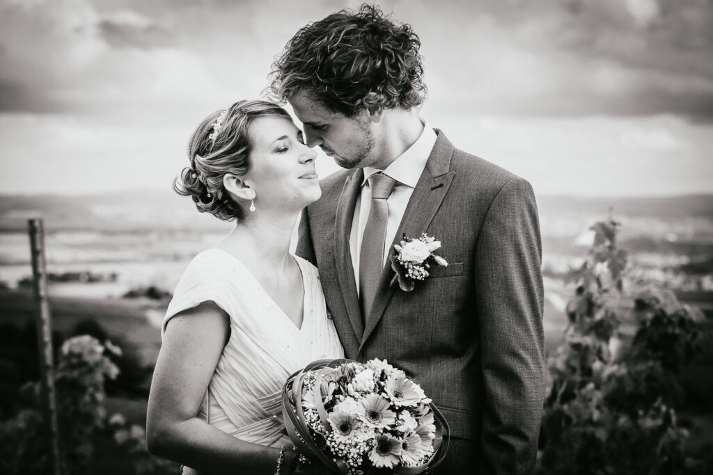 Den besten Zeitpunkt finden wir zusammen, indem wir die verschiedenen Faktoren, wie z.B. Ablauf, besondere Wünsche fürs Shooting oder Entfernung zwischen den unterschiedlichen Orten wie Kirche und Location durchgehen. Das Shooting und eure damit verbundene Abwesenheit sollte weder euch noch eure Gäste belasten. Zeitpunkte wie etwa nach der eigentlichen Trauung sind besonders gut, da eure Anspannung abklingt und alles etwas lockerer und entspannter ist. Das sieht man auch in den Fotos.